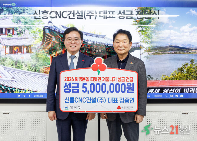 강추위가 일주일 넘게 이어지고 있는 가운데 서울 강서구(구청장 진교훈)에 소외계층을 돕기 위한 온정이 줄을 잇고 있다. 강서구는 26일(월) 김종연 신흥CNC건설 대표로부터 이웃돕기 성금 5백만 원을 전달받았다. 김종연 대표는 지난 2019년부터 현재까지 누적 성금 6천6백만 원으로, 강서구 기부자 명예의 전당에도 헌액된 바 있다. 같은 ...