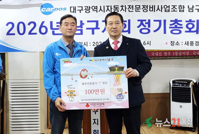 (뉴스21통신) 권혜선기자 = 대구자동차전문정비사업조합 남구지회(지회장 서영철)는 매년 지역 내 소외된 이웃을 돕기 위한 성금을 기탁하며, 따뜻한 나눔을 실천하고 있다. ▲ 남구청(사진제공)남구지회는 지난 20일 남구청에 불우이웃돕기 성금 100만원을 전달했다. 성금은 남구지회 소속 조합원들이 한마음으로 뜻을 모아 마련한...
