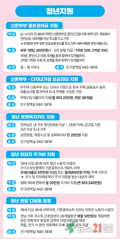 [뉴스21 통신=박철희 ] 진도군(군수 김희수)이 청년층의 지역 정착과 자립을 체계적으로 지원하기 위해 주거, 일자리, 문화복지 전반을 아우르는 맞춤형 청년정책을 본격 추진한다.