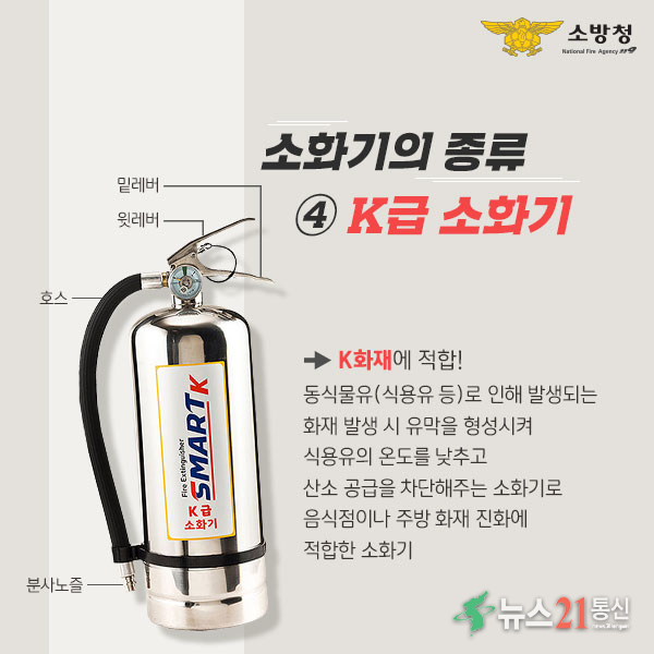음식점이나 주방 화재 진압에 적합한 K급 소화기.충북 제천소방서(서장 오권택)는 겨울철을 맞아 음식점 주방에서 발생할 수 있는 화재 예방을 위해 화기 취급에 각별한 주의를 당부했다.