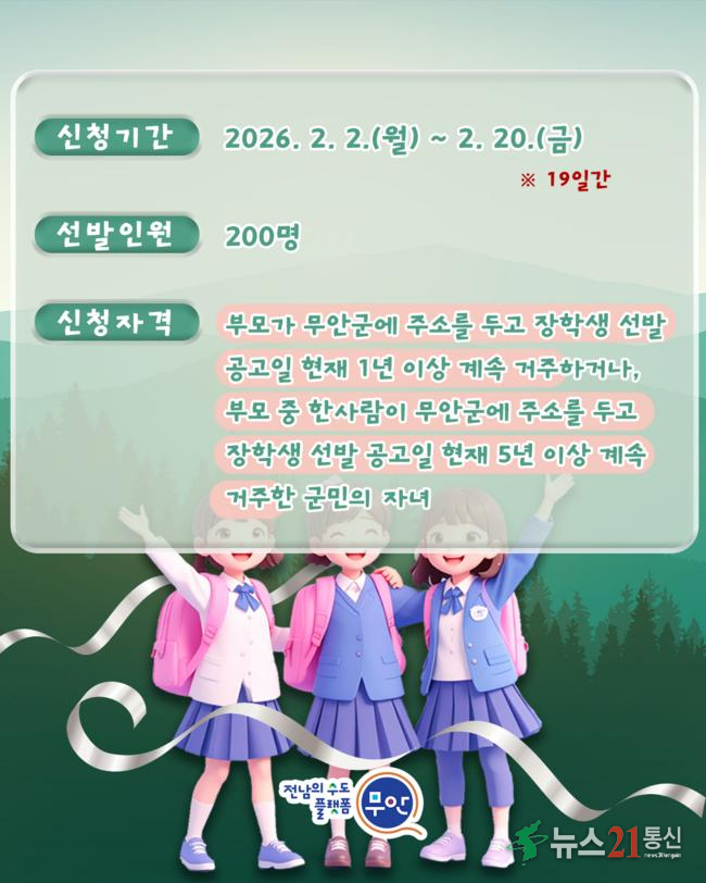 [뉴스21 통신=박철희 ] 무안군승달장학회(이사장 김산)가 지역 발전을 이끌 우수 인재 양성을 위해 오는 2월 2일부터 20일까지 2026년도 상반기 승달장학생을 모집한다.