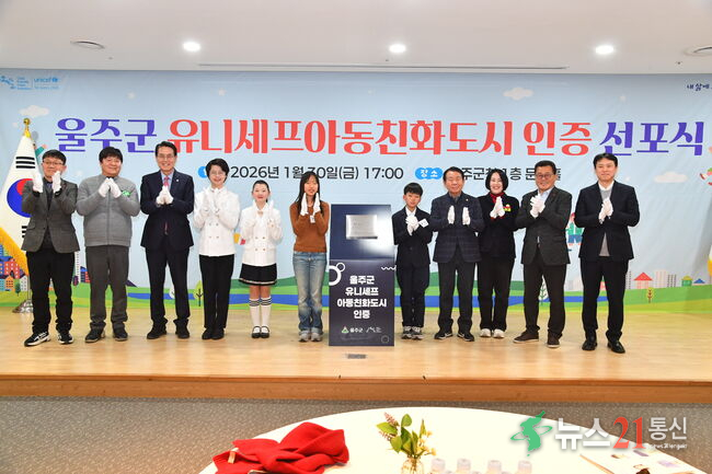 울산 울주군이 30일 군청 문수홀에서 이순걸 울주군수와 최길영 울주군의회 의장, 서범수 국회의원 등 100여명이 참석한 가운데 ‘아동친화도시 인증 선포식’을 개최했다.이번 선포식은 울주군의 유니세프 ‘아동친화도시’ 공식 인증을 기념하고, 아동의 권리가 존중 받는 도시 조성을 위한 실천의지를 공유하기 위해 마련됐..