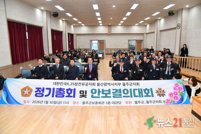 대한민국 6.25참전유공자회 울산광역시 울주군지회(회장 복인규)가 30일 울주군 보훈회관 3층 대회의실에서 2026년도 정기총회 및 안보결의대회를 개최했다.이번 행사는 한 해의 운영 방향을 공유하는 정기총회를 시작으로, 모범회원 표창, 축사, 안보결의문 낭독 등이 진행됐다. 정기총회에서는 2025년도 사업 결산과 예산 집행 결과를 심의&mid...