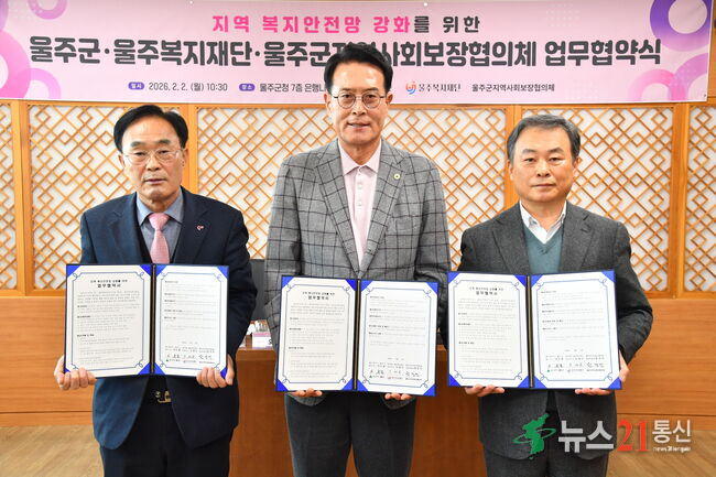 울산 울주군은 2일 군청 은행나무홀에서 울주복지재단, 울주군지역사회보장협의체와 함께 지역 복지안전망 강화를 위한 업무협약을 체결했다.
