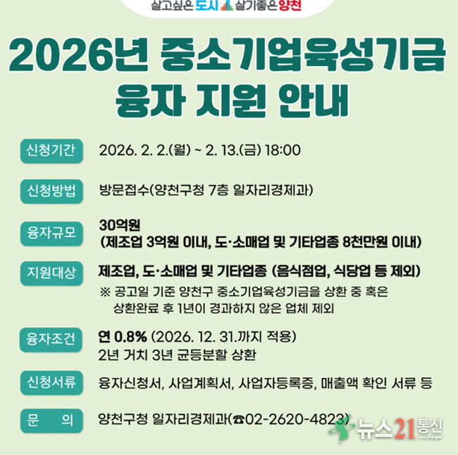 양천구(구청장 이기재)는 경기침체 장기화로 경영 부담이 가중되고 있는 중소기업과 소상공인의 자금난 완화를 위해 2026년 상반기 30억 원 규모의 ‘중소기업 육성기금’ 융자지원에 나선다고 3일 밝혔다.