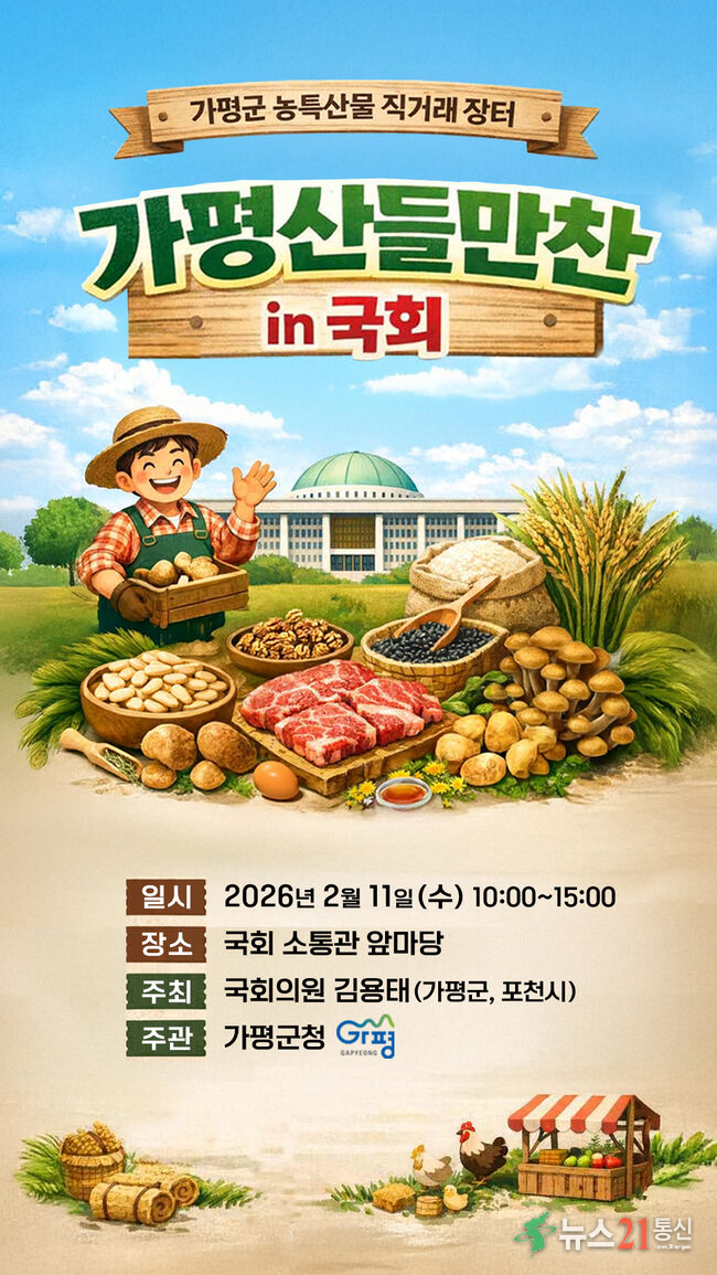 가평군은 오는 11일 오전 10시부터 오후 3시까지 국회 소통관 앞마당에서 ‘가평산들만찬마켓 in 국회’ 농특산물 직거래 장터를 개최한다고 밝혔다. 이번 행사는 김용태 국회의원실이 주최하고 가평군이 주관한다.