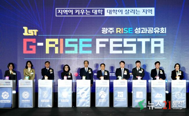 제1회 광주 라이즈 성과공유회(사진=광주광역시제공)[뉴스21통신/장병기 기자] 강기정 광주광역시장은 5일 오후 김대중컨벤션센터에서 열린 제1회 광주라이즈 성과공유회 'G-라이즈 페스타(RISE FESTA)'에 참석해 지역과 대학의 동반성장을 위한 의지를 강조했다. 이날 행사에서 강 시장은 참석자들과 함께 '비전 큐브 점등식' 을 진행하며 협력 의지를 다졌고, 기념사진 촬영을 통해 성과를 공유하는 시간을 가졌다.