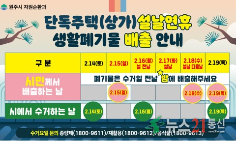 장성미 자원순환과장은 “연휴 기간 생활폐기물 수거 일정을 참고하셔서 깨끗한 원주시를 함께 만들어 주시길 바란다”라고 말했다.