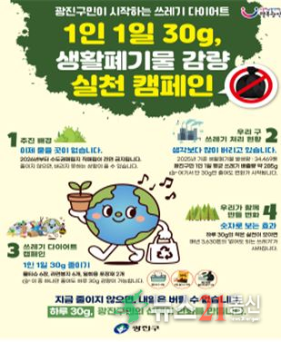 광진구(구청장 김경호)는 수도권 생활폐기물 직매립 전면 금지 시행에 선제적으로 대응하기 위해, 전년 대비 생활쓰레기 6% 감량을 목표로 구민과 함께하는 「1인 1일 30g 쓰레기 다이어트, ‘1.1.30.쓰다 캠페인’」을 본격 추진한다.