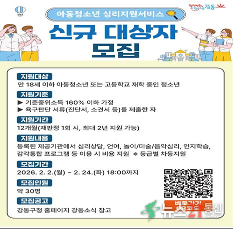 서울 강동구(구청장 이수희)는 2월 2일부터 24일까지 강동구 아동‧청소년을 대상으로 ‘아동‧청소년 심리지원 서비스’ 대상자를 모집한다고 밝혔다.