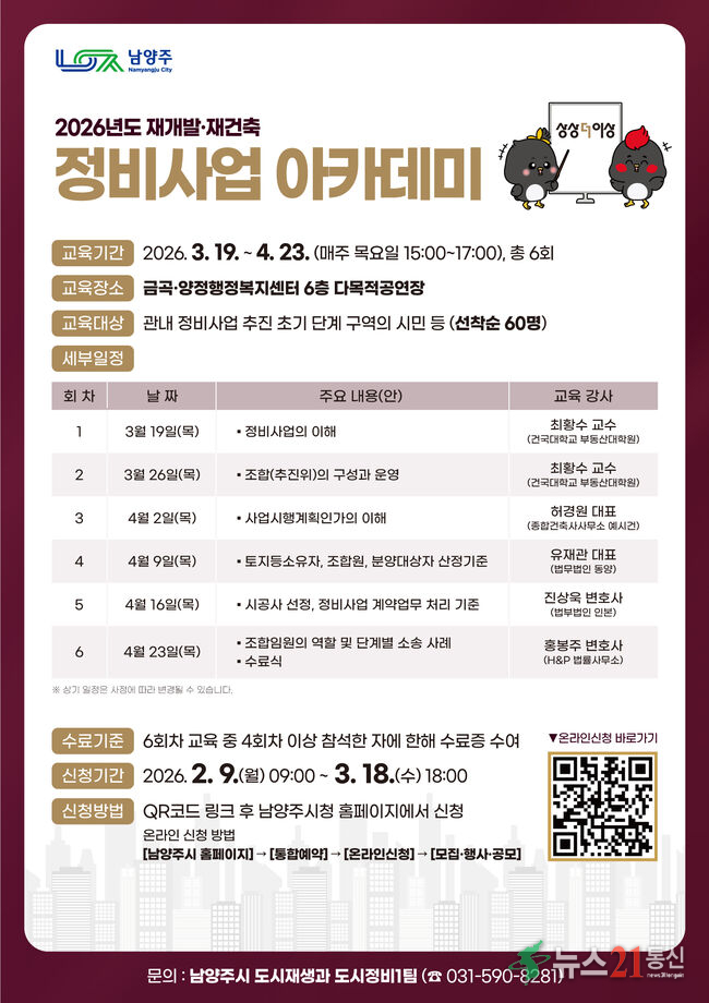 남양주시는 오는 3월 19일부터 정비사업에 관심 있는 시민을 대상으로 ‘2026 상상더이상 정비사업 아카데미’를 열고, 이에 앞서 2월 9일부터 참가 신청 접수를 진행한다고 6일 밝혔다.