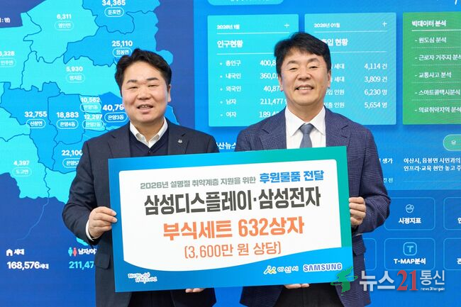 아산시(시장 오세현)는 설 명절을 맞아 삼성디스플레이와 삼성전자가 지역 내 사회복지시설 33개소에 부식세트 632상자(약 3,600만 원 상당)를 전달하며 따뜻한 나눔을 실천했다고 밝혔다.