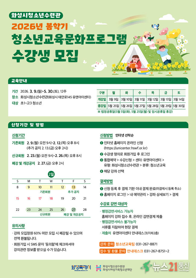 (재)화성시여성가족청소년재단(대표이사 염미연) 화성시청소년수련관은 청소년의 균형 있는 성장과 시민의 건강증진 및 여가 활동의 질 향상을 위해 ‘2026년 봄학기 청소년교육문화프로그램’, 및 ‘스포츠(빙상장, 실내체육관) 프로그램’ 수강생을 모집한다고 밝혔다.