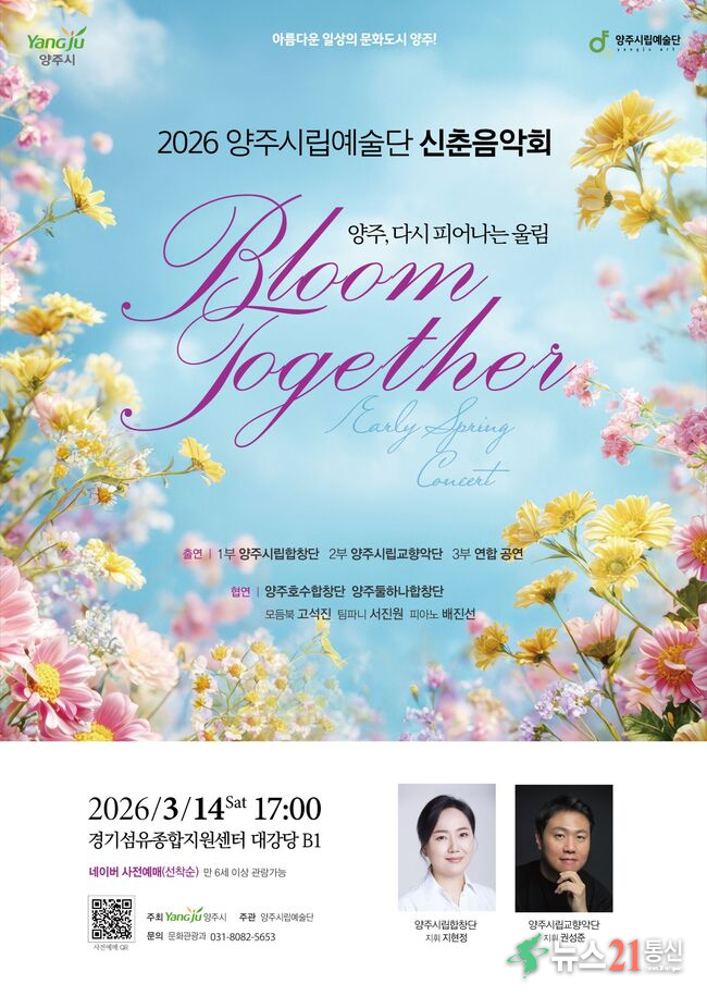 공연은 만 6세 이상 양주 시민이면 누구나 무료로 관람할 수 있으며, 오는 2월 13일(금) 오전 10시부터 네이버 예약을 통해 선착순 사전예약제로 운영된다. 자세한 내용은 포스터 내 큐알(QR)코드를 통해 확인할 수 있다.
