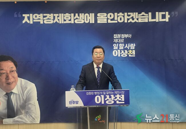 12일 제천시청 브리핑 룸에서 제천 시장 출마를 선언한 이상천 전시장이“지역경제회생에 올인 하겠습니다”라는 대형 슬로건과 함께 “집권정부와 제대로 일할 사람 이상천”이라는 문구가 적혀 있는 경제 회생과 중앙정부 협력을 핵심 메시지로 내세웠다.