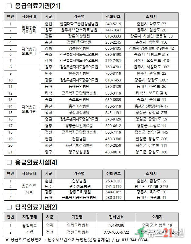 □ 박송림 강원특별자치도 복지보건국장은 “설 연휴 기간 동안 병·의원과 약국이 차질 없이 운영되도록 빈틈없는 비상진료체계를 유지해 도민과 방문객 모두가 안전한 명절을 보낼 수 있도록 최선을 다하겠다”고 밝혔다.출처:강원도 보도자료