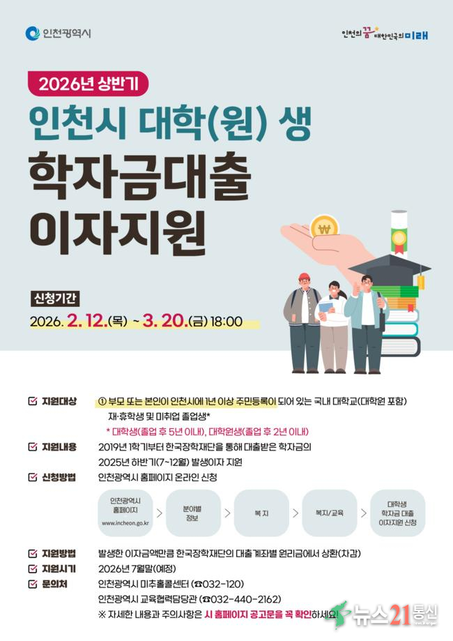 인천광역시(시장 유정복)는 대학(원)생의 학자금대출 이자 부담을 완화하기 위해 2026년 상반기 학자금대출 이자 지원 신청을 오는 2월 12일부터 접수한다고 밝혔다.