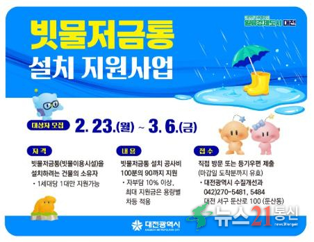 대전시는 기후변화로 인한 가뭄과 물 부족 문제에 선제적으로 대응하고 물 재이용 문화 확산을 위한‘2026년 빗물저금통 설치 지원사업’을 추진한다고 밝혔다.