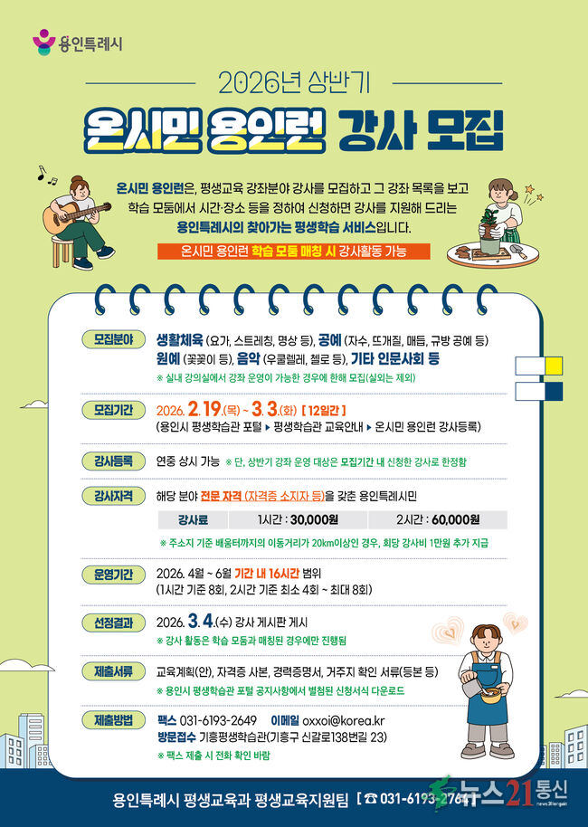 용인특례시(시장 이상일)는 19일부터 3월 3일까지 시민이 원하는 시간과 장소로 강사가 찾아가는 배달학습 ‘온시민 용인런’ 강사를 모집한다고 밝혔다.