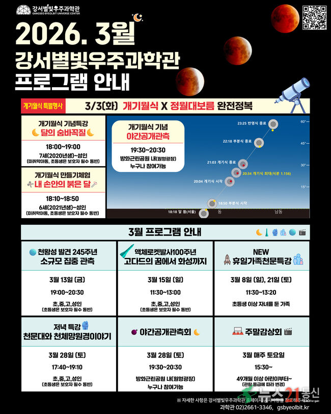 서울 강서구(구청장 진교훈) 강서별빛우주과학관(금낭화로 178)은 개기월식을 맞아 다채로운 천문 프로그램을 운영한다고 밝혔다.
