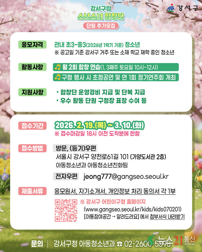 강서구 관계자는 “합창단은 아이들의 꿈과 희망을 노래로 실현하는 소중한 무대”라며, “이번 신규 단원 모집을 통해 더 많은 청소년이 합창을 통해 예술적 재능과 협동심을 키우길 바란다”고 말했다.