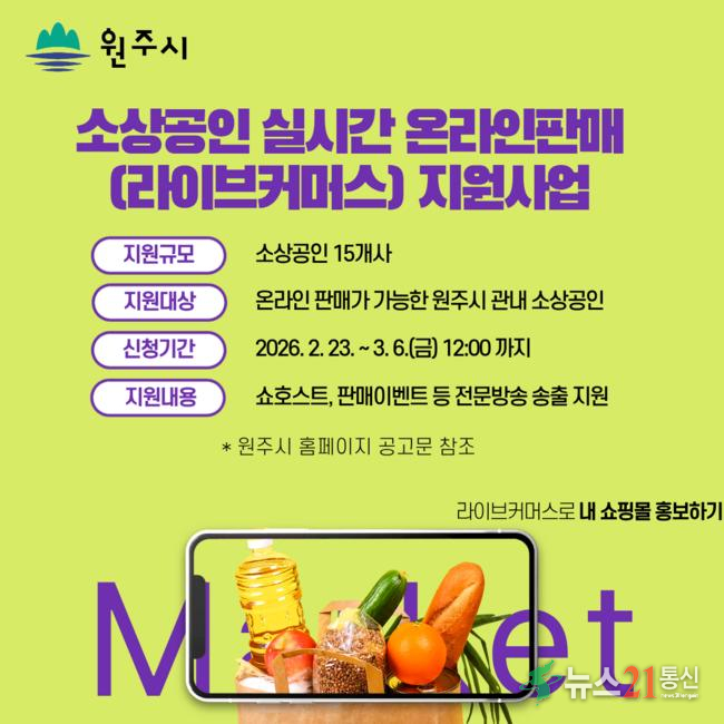 원주시는 소상공인의 디지털 전환을 촉진하고 온라인 플랫폼 시장에서의 매출 증대를 지원하기 위해 ‘원주시 소상공인 실시간 온라인 판매(라이브커머스) 지원사업’에 참여할 소상공인을 모집한다.