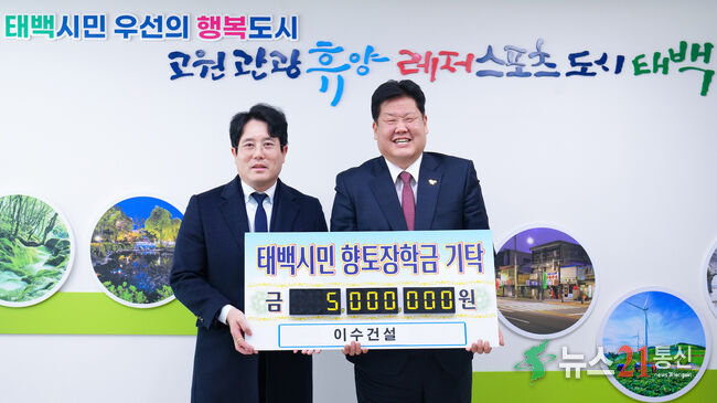 태백시민향토장학회(이사장 이상호)는 이수건설(주)(대표 김학봉)이 지난 20일 태백시청을 방문해 지역 인재 육성을 위한 장학금 500만 원을 기탁했다고 밝혔다.