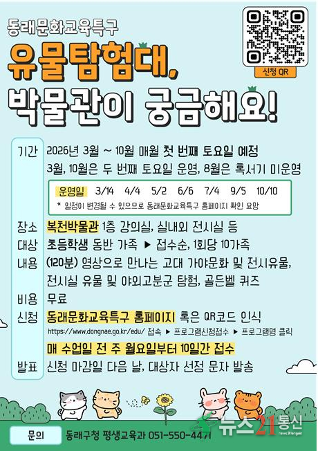 부산 동래구(구청장 장준용)는 오는 3월부터 10월까지 복천박물관 연계 프로그램인 ‘유물탐험대, 박물관이 궁금해요!’를 운영한다고 밝혔다.