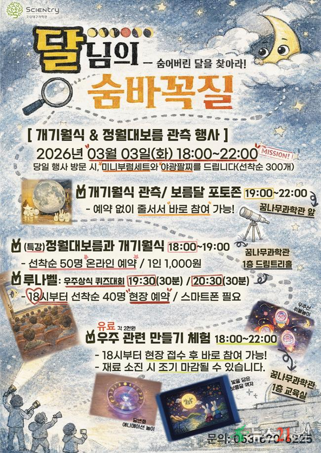 국립대구과학관(관장 이난희)은 개기월식과 정월대보름을 기념해 3월 3일(화) ‘개기월식&정월대보름 관측행사: 달님의 숨바꼭질’을 개최한다.