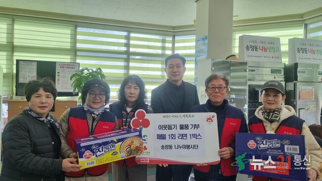 북구 송정동 나누미봉사단은 23일 송정동 나눔냉장고에 라면 1박스를 기부했다. 봉사단은 올해 매월 1차례씩 라면 1박스를 기부하기로 했다.