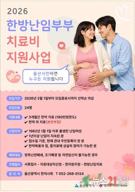 울산시는 난임 증가와 치료 장기화로 인한 경제적 부담을 완화하고 출산 친화 환경 조성을 위해 ‘한방 난임부부 치료비 지원사업’을 추진한다고 밝혔다.