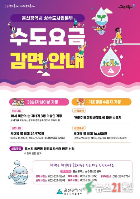 사진=울산광역시 제공 울산시 상수도사업본부“상·하수도 요금 감면 혜택 챙기세요”3(손)자녀 이상 가정·기초생활수급자 대상 요금 감면 지원 울산시 상수도사업본부는 지난해에 이어 올해도 관내 3자녀(손자녀 포함) 이상 가정 및 기초생활수급자를 대상으로 상·하수도 요금 감면 혜택을 지원한다고 밝혔다. 3(손)자녀 이상 요금 감면 정책은 지난 2009년 8월 26일 「아이낳기 좋은세상 울산운동본부」출범과 함께 한시적으로 추진하던 것을 조례 개정으로 연장 결정(2020년) 및 감면 대상도 확대(2022년)됐다. 이에 따라 울산시에 주민등록을 둔 18세 미만 3자녀 이상 가정뿐 아니라 손자녀인 경우로 대상 범위를 확대해 최대 15㎥에 해당하는 상‧하수도 요금 감면 혜택을 지원하고 있다. 울산시는 올해 3(손)자녀 이상 상·하수도 요금 감면을 위해 18억 2,500만 원을 편성했다. 이를 통해 월 최대 2만 4,970원 감면 지원으로 해당 가정의 경제적 부담을 경감하는 데 실질적 도움을 줄 것으로 예상된다. 또한 기초생활수급자 가정에는 최대 10㎥에 해당하는 상‧하수도 요금 감면 지원으로 월 최대 1만 6,650원 혜택을 받을 수 있다. 해당 감면 혜택을 받고자 하는 시민은 자격 기준을 확인해 주소지 구군 행정복지센터 또는 상수도사업본부 지역사업소에 방문 신청이 가능하다. 상수도사업본부 관계자는 “3(손)자녀 이상 가정을 위한 체감도 높은 생활 밀착형 감면 혜택을 제공해 다자녀 가정에 대한 사회적 우대 분위기가 조성되길 기대한다”라며 “내 이웃인 기초생활수급자에게 깨끗한 물 한방울로 울산의 온정을 나눌 수 있도록 계속해서 노력하겠다”라고 말했다. 끝.출처:울산광역시 보도자료 |