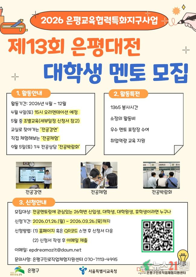 멘토 모집 기간은 다음달 26일까지이며, 신청은 은평구진로직업체험지원센터 누리집 또는 홍보물 속 큐알(QR)코드를 통해 신청서를 내려받아 전자우편으로 제출하면 된다.