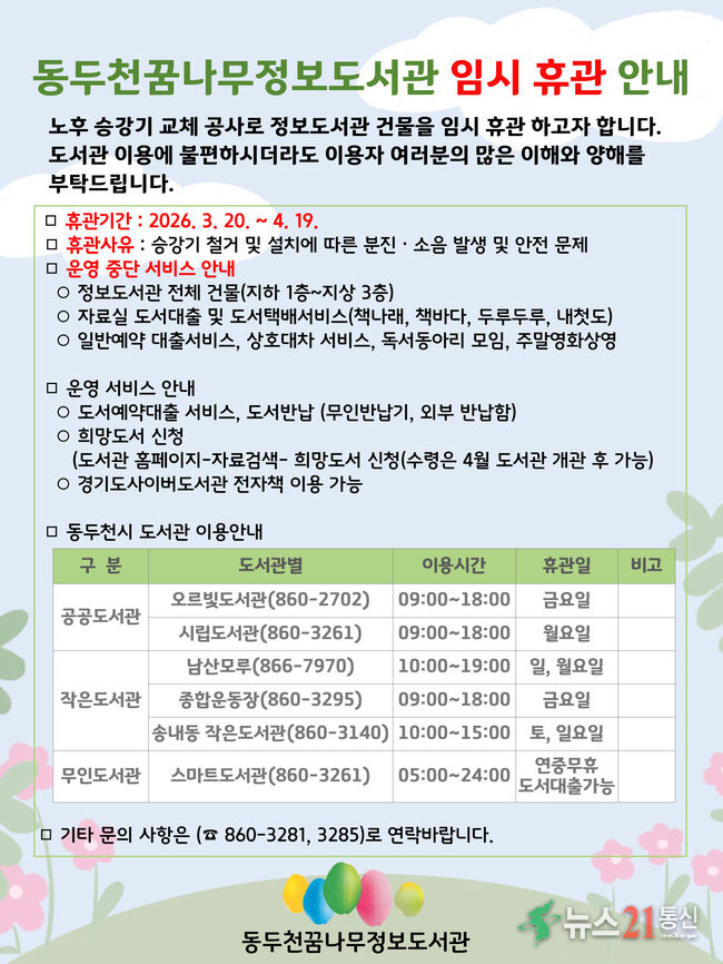 한편 승강기 교체 공사 및 휴관 기간 중 도서관 서비스 운영과 관련한 자세한 사항은 꿈나무정보도서관 누리집(lib.ddc.go.kr) 또는 운영실(☎ 860-3281)로 문의하면 된다.출처:경기도 동두천 보도자료