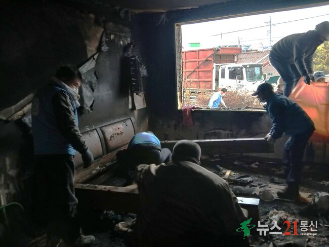 참여 대원들은 훼손된 내부 공간을 정비하고 불에 탄 가구와 집기류를 정리하는 등 현장 복구 작업을 이어갔다.