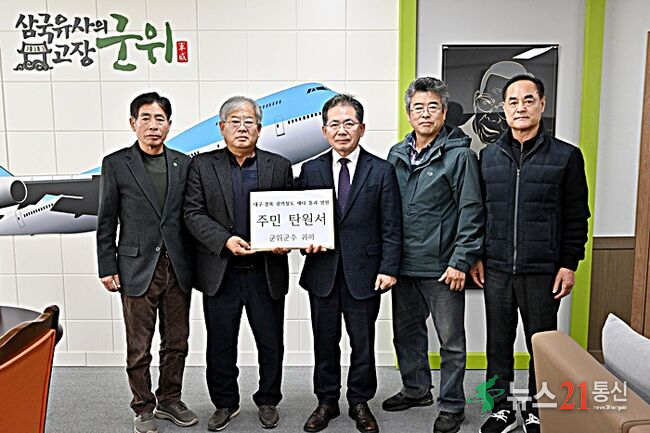 군위군 주민들이 뜻을 모아 대구~경북 광역철도 사업의 조속한 추진을 촉구하는 주민 탄원서 및 서명부를 군위군수에게 제출했다.