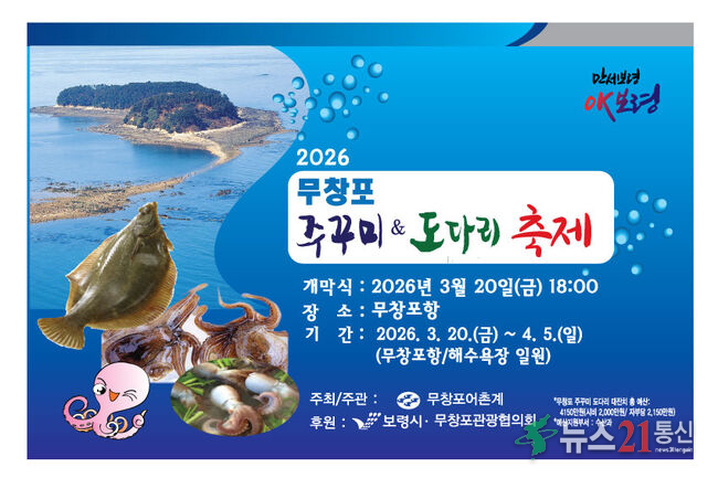 보령의 대표 수산물 축제인 ‘2026 무창포 주꾸미&도다리 축제’가 제23회를 맞아 3월 20일 개막식을 시작으로 4월 5일까지 17일간 무창포항·해수욕장 일원에서 펼쳐진다. 무창포어촌계(어촌계장 김병호)가 주최하는 이번 행사는 보령의 대표 봄철 수산물인 주꾸미와 도다리 등 먹거리와 다양한 체험을 통해 관광객들을 유치하.