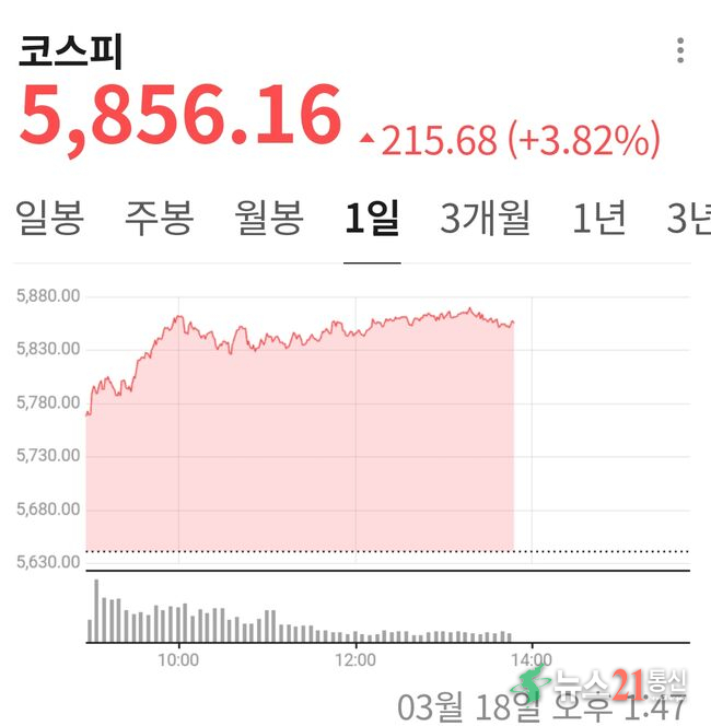 코스피가 18일 13시 현재 5,700선 후반과 5,800선 초반 사이에서 등락을 하고 있다.