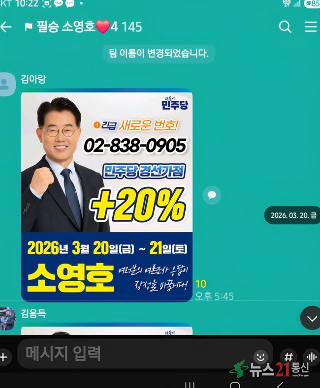현재 소 후보는 김한종·박노원·유성수 후보가 제기한 ‘권리당원 자격 요건 미비’ 의혹에 대해 ‘허위사실 유포’라며 맞고소를 진행 중이다. 하지만 이번 ‘가점 왜곡’ 고발은 소 후보가 본인의 명의로 직접 발송한 ‘물증(문자 메시지)’이 명확히 존재해 방어 논리가 궁색할 수밖에 없다.