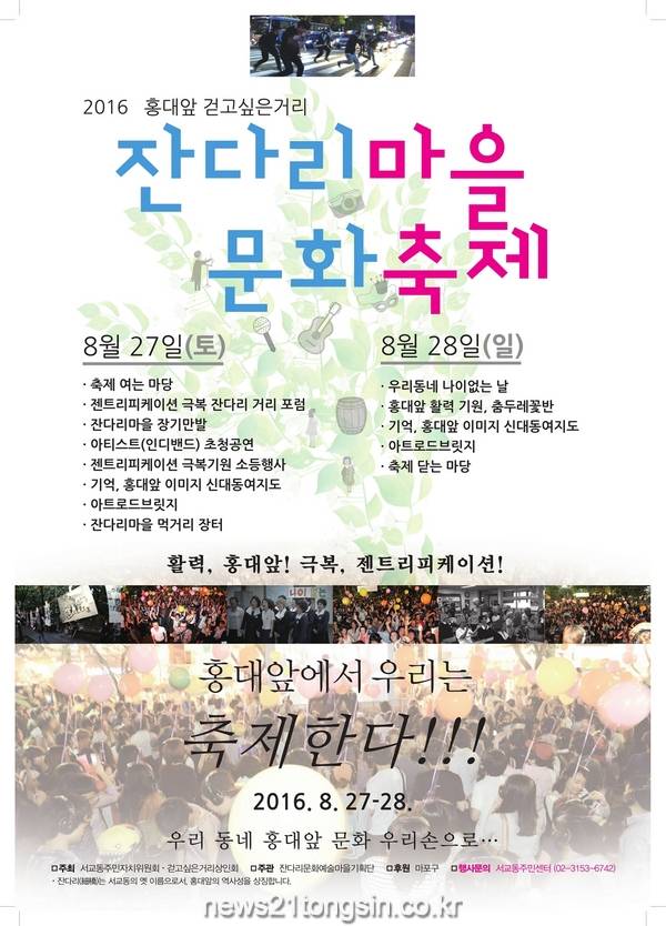 마포구(구청장 박홍섭)가 젊은이들로 활력이 넘치는 홍대앞 걷고싶은거리에서 8월 마지막 주말, 서교동 주민과 상인 및 문화예술인들이 협력해 ‘2016 잔다리마을 문화축제’를 개최한다고 밝혔다.