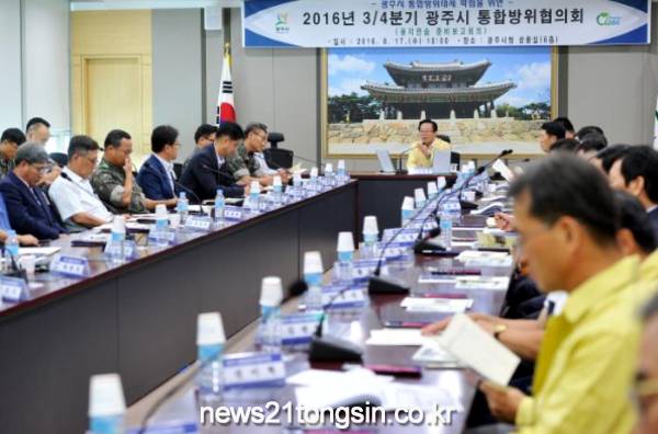 광주시 통합방위협의회(의장 조억동 광주시장)는 17일 시청 상황실에서 통합방위협의회 위원, 안보정책자문위원, 통리장협의회장, 예비군지휘관 등 60여명이 참석한 가운데 “2016년 3분기 통합방위협의회 및 을지연습 준비보고회”를 개최했다.