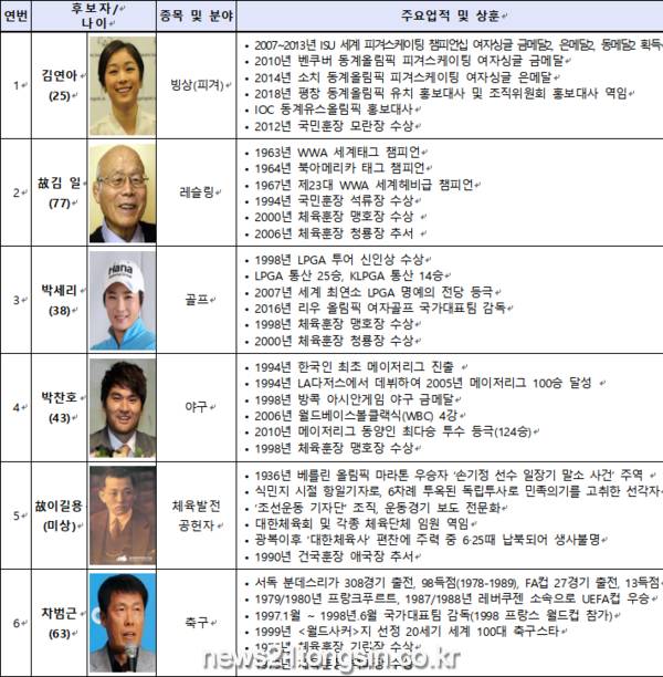 최종후보자 6명은 ‘올림픽에서 금, 은메달을 획득한 피겨퀸’ 김연아(빙상_피겨, 25세), ‘프로레슬링의 선구자’ 故김일(레슬링, 77세), ‘대한민국 여자골프계의 살아있는 전설’ 박세리(골프, 38세), ‘메이저리그 코리안 특급’ 박찬호(야구, 43세), ‘손기정 일장기 말소 사건의 주역’ 故이길용(체육발전 공헌자, 미상), ‘분데스리가의 갈색 폭격기, 차붐’ 차범근(축구, 63세)이 선정됐다.