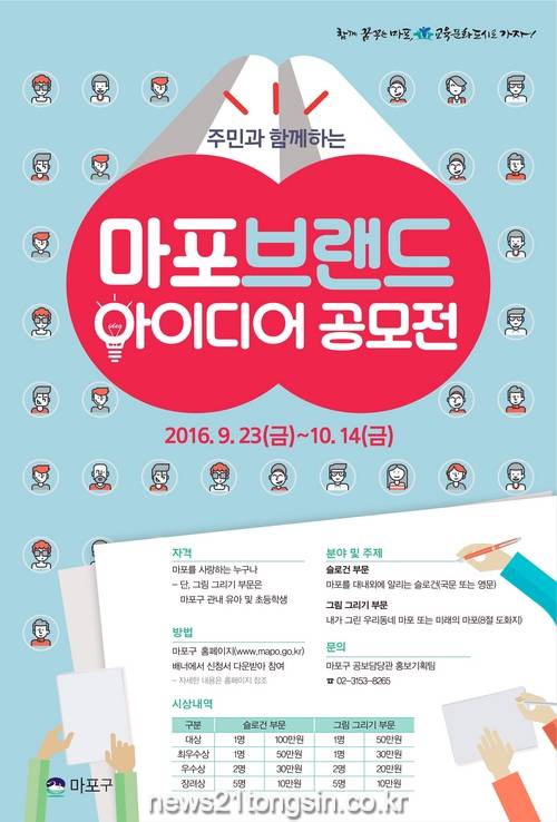 구는 주민들의 다양한 의견과 참신한 아이디어를 통합 브랜드 개발 과정에 반영하고자 이번 ‘마포브랜드 아이디어 공모전’을 실시하며 슬로건 부문과 그림 그리기 부문으로 나눠 진행하기로 했다.