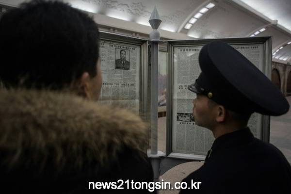 북한 주민들이 평양 지하철역에 배치된 신문에서 쿠바 지도자인 피델 카스트로의 사