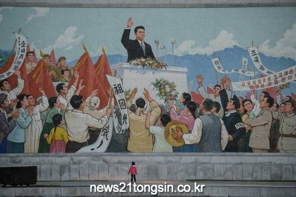 평양에서 모자이크로 만들어진 김일성 선전 앞에 서 있는 아이.