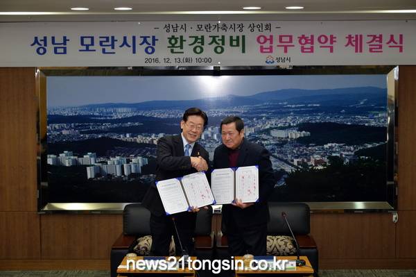 이날 협약식에는 이재명 성남시장과 김용복 모란가축시장 상인회장 등 상인 20명, 시의원, 중원구청장, 관계 공무원 등이 배석했다.