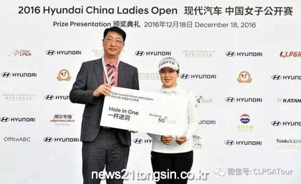 김지현2(25, 롯데)은 대회 2라운드 9번 홀(파3·165야드)에서 6번 아이언으로 티샷한 볼이 그린핀 앞 6m에 떨어진 뒤 그대로 홀을 파고 들어 행운의 홀인원을 기록했다. 부상으로 받은 SG골프 시뮬레이터는 중국 현지 판매가 기준 약 4천만원 상당으로 왠만한 승용차 가격에 버금가는 것으로 알려졌다.
