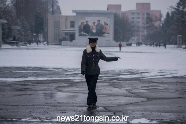 김정숙 방직공장 안뜰에서 경비원이 서 있는 모습.
