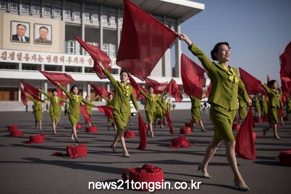 북한에서 김정은 국무위원회 위원장을 ‘당과 국가의 최고수위’에 추대한 5돌 경축 중앙보고대회가 열린 가운데 평양 광장에서 선전대 단원들이 공연하는 모습.
