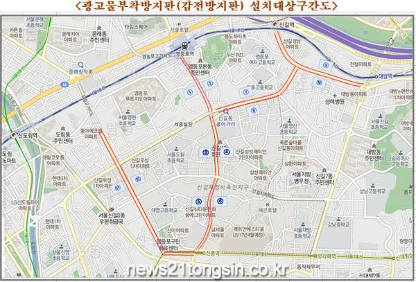올해 설치되는 구간은 ▲대방역에서 신길역 구간 양방향과 ▲신길삼거리에서 신풍역 구간 ▲신풍역에서 도림사거리 구간 총 7.5km로 가로등, 전신주, 신호등 등에 총 603개의 방지판을 설치한다.